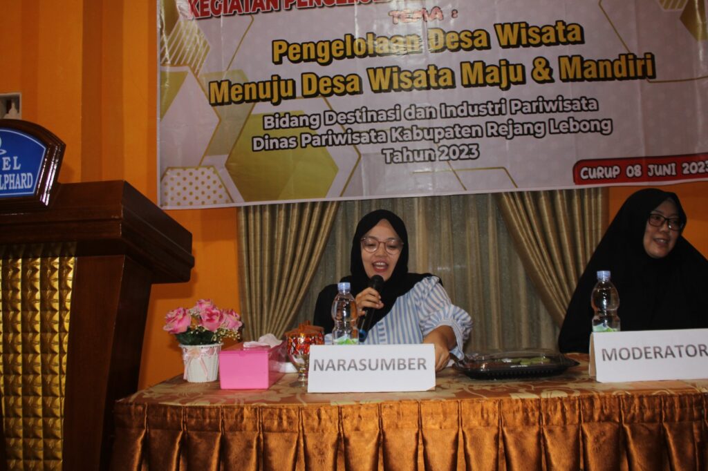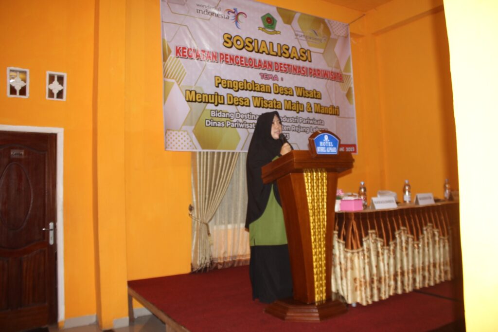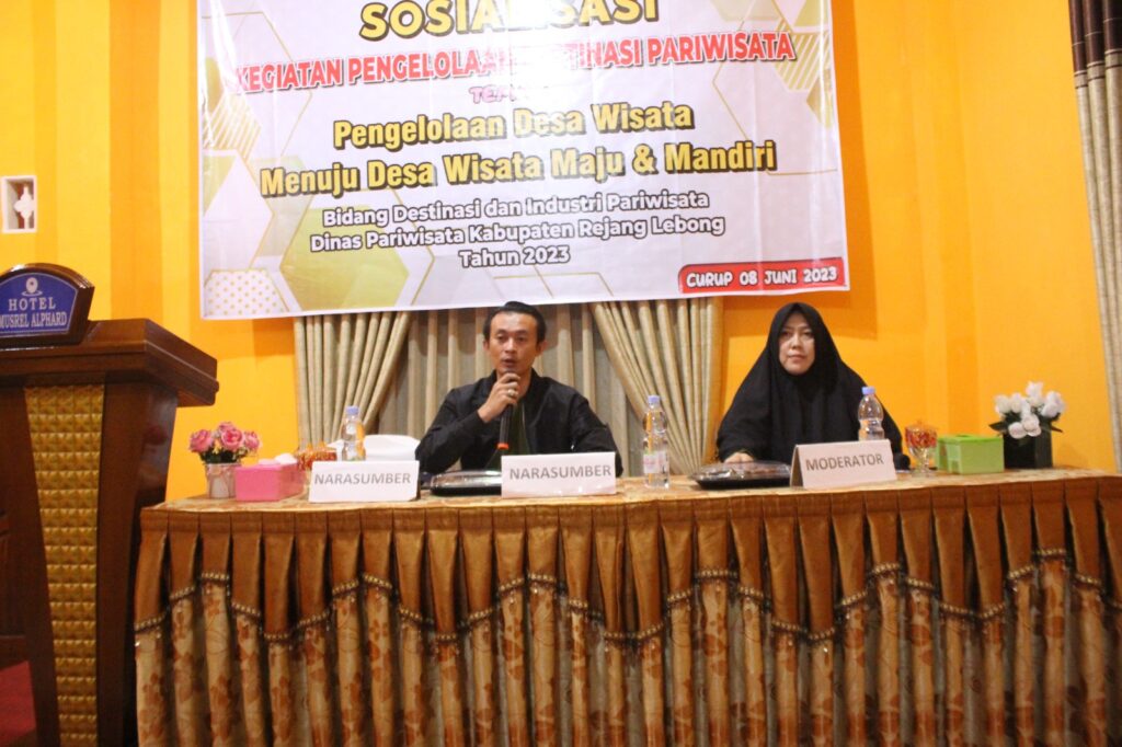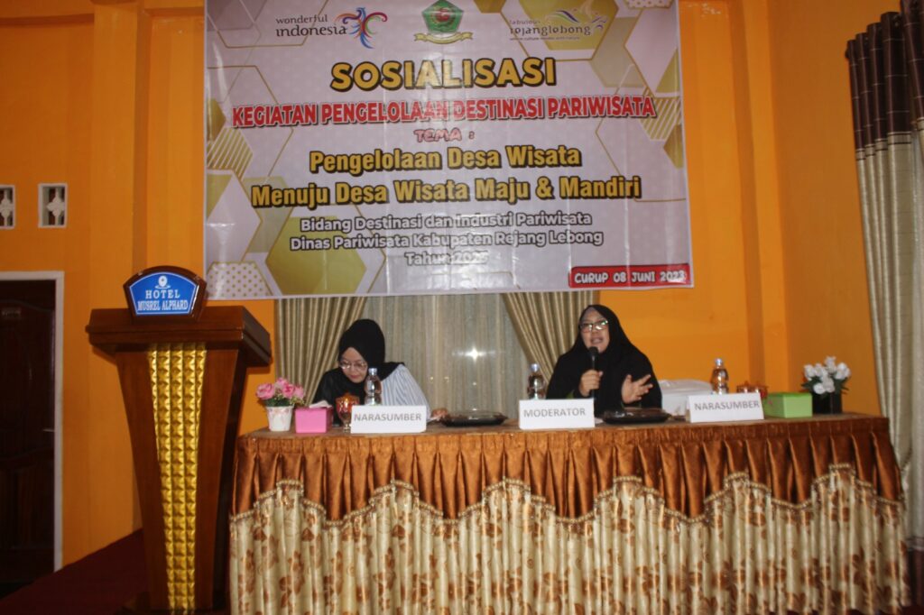 Dengan upaya mewujudkan Desa Wisata Rejang Lebong menjadi Desa Wisata maju dan mandiri. Maka Sosialisasi Kegiatan Pengelolaan Destinasi Pariwisata dengan tema “Pengelolaan Desa Wisata Menuju Desa Wisata Maju Dan Mandiri Di Kabupaten Rejang Lebong”, kembali digelar, Kamis 08 Juni 2023 bertepatan di Aula Hotel Musrel Alphand Curup. Di mana Desa Wisata sebagai satu kesatuan ekosistem memerlukan satu pemahaman yang terintegrasi dalam mengeksplorasi keunikan, kelebihan serta melihat kekurangan, serta untuk menetapkan produk unggulan untuk ke depannya dijadikan satu kekuatan atraksi Desa Wisata. Sehingga dapat menjadi destinasi menarik di pertumbuhan Ekonomi Kreatif yang baik.
